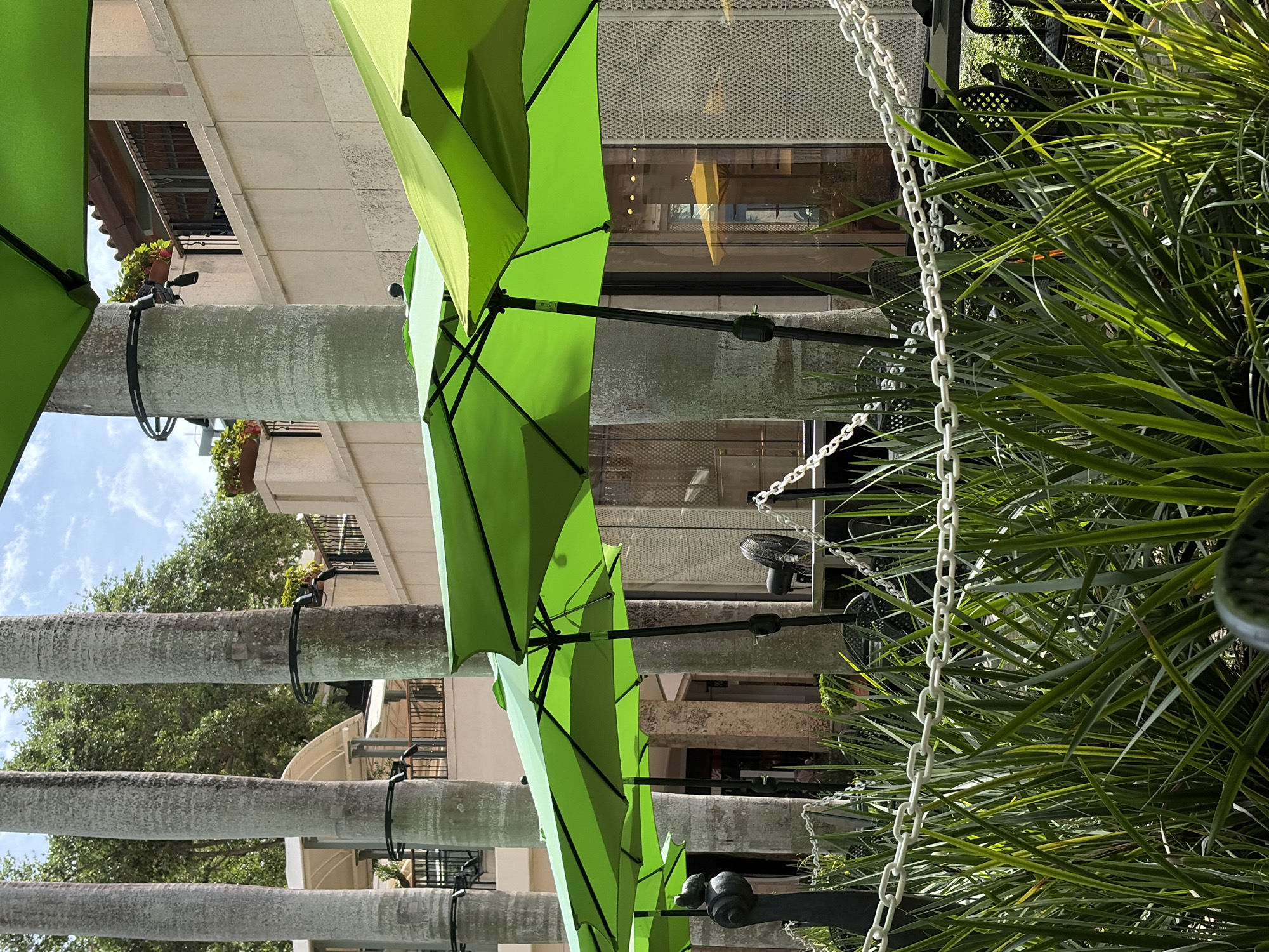 Here's a description of the image: The image shows a ground-level view in Coral Gables, Florida. A row of tall, cylindrical palm trees lines a sidewalk or outdoor area. Each tree has a black circular band around it, presumably to support something attached to the tree. Bright green patio umbrellas are attached to the trees with black metal fixtures. To the right of the frame, a lush green bush or shrub grows. White plastic chains hang near the bush. The background reveals a building facade with a combination of stone or concrete and what appears to be windowed or latticed sections. A small balcony with plants is visible on an upper level. The sky is partly visible between trees, showing some light cloud cover.