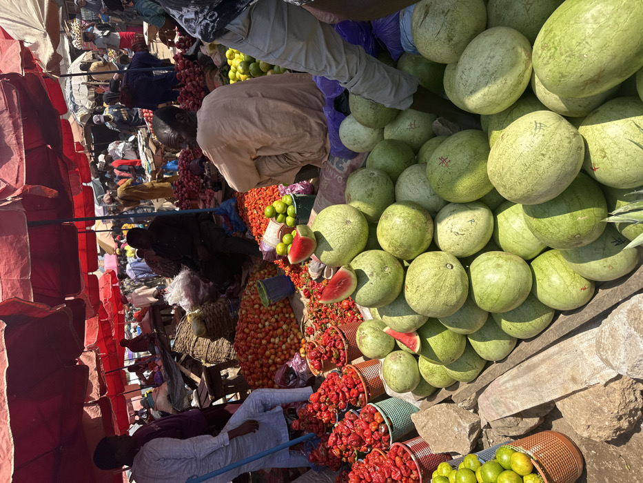 The image depicts a bustling outdoor market scene in Karum, Nigeria, characterized by bright daylight and widespread shade provided by numerous large red canopy umbrellas. In the foreground and mid-ground, extensive quantities of produce are displayed directly on the ground or within various containers. A prominent mound consists of approximately 50-60 spherical watermelons, varying in light green and muted patterned hues. Several watermelons have small, triangular cuts, exposing bright red flesh. Some watermelons bear faint red markings. To the left of the watermelons, multiple conical baskets are filled with vibrant red Scotch bonnet peppers. Adjacent to these, a smaller collection of green limes or similar citrus fruits is visible in a woven basket. Further back, large piles of red tomatoes and additional red chili peppers are scattered on the ground. Numerous individuals, primarily adult males, populate the market space. In the mid-ground, a man in a light-colored tunic is seated on the ground, facing away from the viewer, near a pile of red peppers and limes. To his left, a man in a light-colored long-sleeved tunic stands, partially obscured. On the right, a forearm and hand, belonging to a person wearing a dark-sleeved garment, are visible reaching towards the watermelon display. Other figures are observable in the background, walking, standing, and interacting within the crowded environment, mostly under the shade of the red umbrellas. Most individuals wear traditional Nigerian attire, including long tunics. The ground surface appears to be uneven dirt or packed earth with some scattered rocks and wooden elements. The overall scene conveys a dense, active commercial environment.