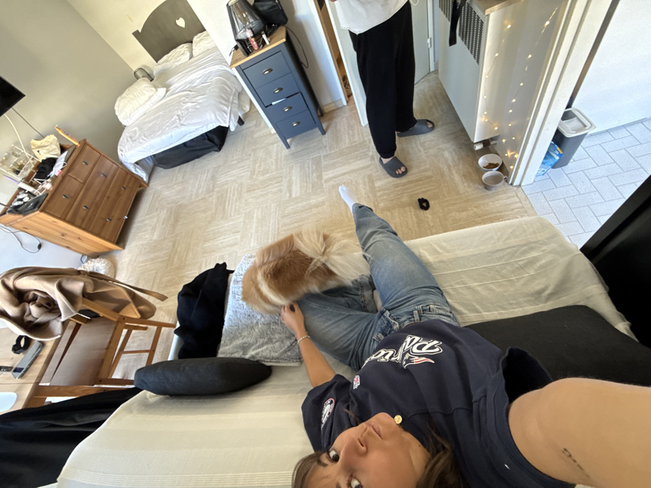 This image displays an indoor residential scene in Cannes, France. The perspective is a wide-angle, tilted view from a low vantage point. A female individual with brown hair, wearing a dark blue t-shirt and blue jeans, reclines on a light-striped sofa in the foreground. Her left arm is visible, revealing a small tattoo on her forearm. She is looking directly towards the camera. Her right hand rests upon a medium-sized dog, which is also on the sofa. The dog has brown and white fur and is facing away from the camera. In the mid-right portion of the frame, the lower body of a second person is visible, clad in black pants and grey slippers. This individual appears to be standing or sitting near a white kitchen counter. The room features a light-colored, patterned floor, possibly laminate or tile, laid in a diagonal or herringbone design. Furnishings include: * A light wooden dining table with a matching chair draped with a beige blanket in the background. A tablet and a dark object rest on the table. * A wooden dresser with multiple drawers, topped with various small personal items, further back. * A bed with white bedding and a dark headboard is visible in the background, suggesting a combined living/sleeping space. * A dark blue cabinet with golden handles and a wooden top, holding what appears to be an organizer with toiletries, is positioned near the second person. * A white kitchen countertop with embedded string lights displays two small cups. A white refrigerator or appliance is beneath this counter. A black hair tie or scrunchie is on the floor near the sofa. The walls are light-colored, and the scene is illuminated by ambient light.