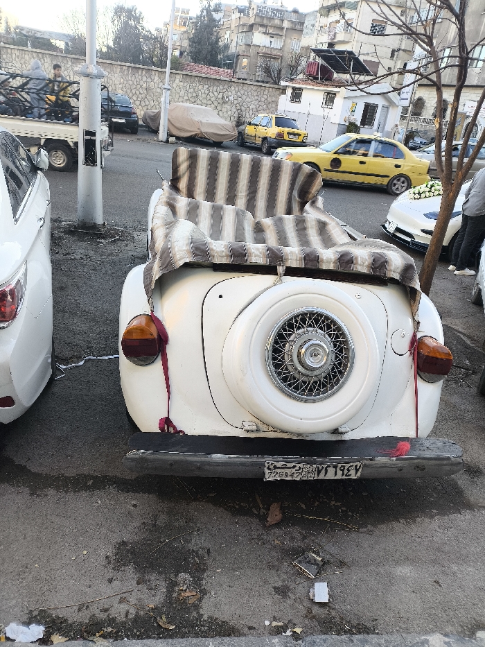 The image depicts an outdoor urban street scene in an unknown city, unknown country. The foreground is dominated by the rear of a white, vintage-style convertible car, featuring a cream and brown striped fabric covering its interior. A wire-spoke spare tire is mounted externally on the rear. Reddish-orange tail lights, each with a red fabric ribbon, flank a dark rear bumper displaying an Arabic license plate with "٧٦٩٤٧" and "٦٢٤٩٤٧". The vehicle rests on stained and debris-strewn asphalt, where a small metallic rectangular object is visible. To the immediate left, the rear-left quarter of a white modern sedan is partially visible. Further left, a white pickup truck carries at least two hooded individuals in its open bed, followed by a dark sedan. In the mid-ground, a white modern sports car, decorated with white floral arrangements on its hood, is parked behind the vintage car, partially obscured by a bare-branched tree. A person in grey pants and white shoes stands near the sports car. Two yellow sedans, consistent with taxis, are visible further down the street. A light-colored utility pole, a stone retaining wall, and a small white building with a dark roof and solar panel are present in the background. Densely packed buildings ascend a hillside in the far background under an overcast sky.