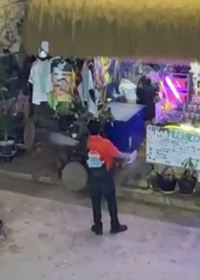 A person in an orange shirt and black pants and shoes is standing on a dirt road facing a colorful vendor stand. The vendor stand has a thatched roof with clothing and other merchandise hanging from it. Behind the vendor stand, there is a building with a sign that reads "SWAN RAY." The person raises their arms and moves them around as if dancing or exercising.