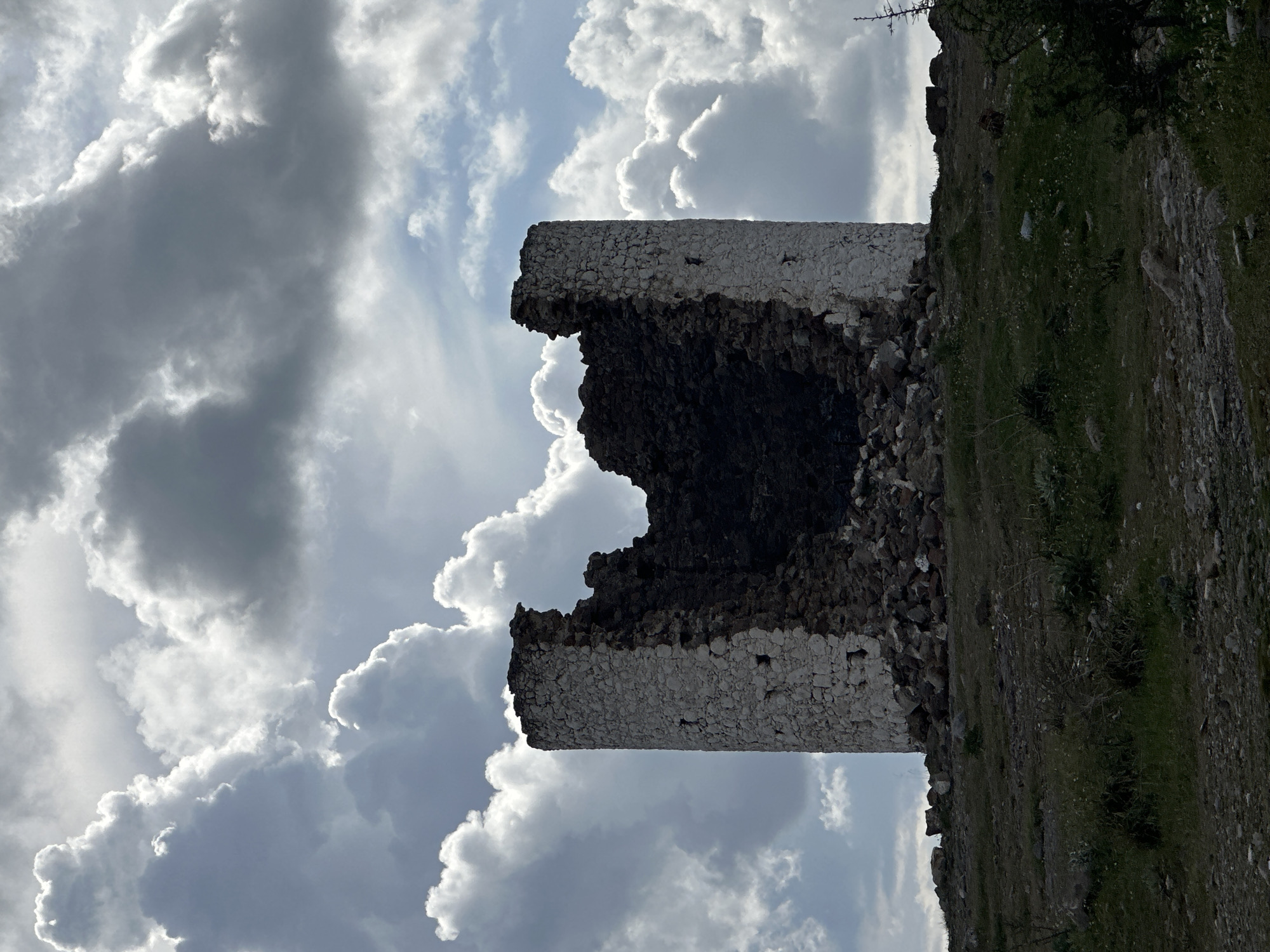 ruined stone tower against a backdrop of cloudy sky