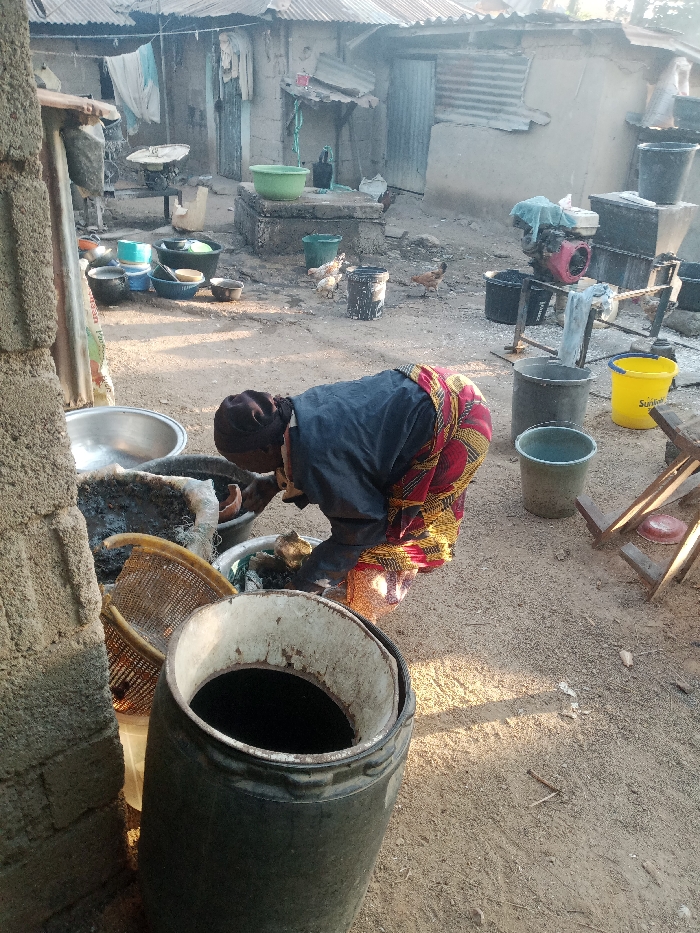 An outdoor scene depicts a woman in a black shirt and red/yellow patterned skirt, bending over various containers. A large black barrel and other receptacles, including buckets and baskets, surround her. In the background, rudimentary buildings are visible, some with corrugated metal roofs. A well-like structure with a green bowl on top sits near a collection of pots and pans. Scattered chickens roam the area. An engine-powered machine stands on a wooden frame amidst buckets.