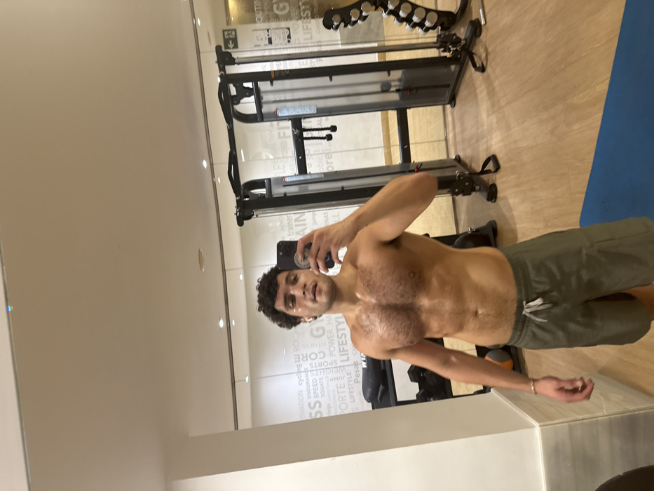 An image captured in a gymnasium in Can Pastilla, Spain, depicts a male subject taking a mirror selfie