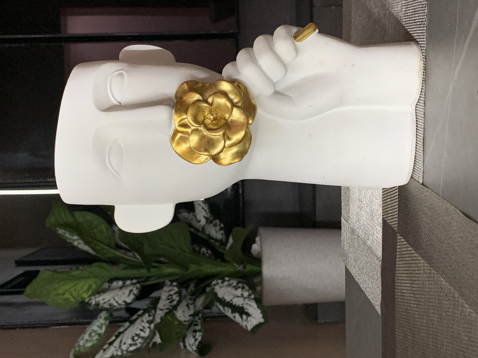 A white, stylized vase shaped like a face and a hand, possibly made of plaster or ceramic. The face features minimalist features, and the hand is holding a golden ring. A large golden flower is near the face. Green and white plant leaves are visible, suggesting that the vase is being used to hold plants. The vase is in front of a brown and grey striped background.