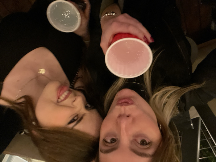 Two women pose cheek-to-cheek, holding up cups. One woman sticks out her tongue and wears a black top with a delicate necklace. The other woman pouts, wearing a black top with a possible leather jacket. Both have light skin. The background appears dimly lit, with railing visible to the right.