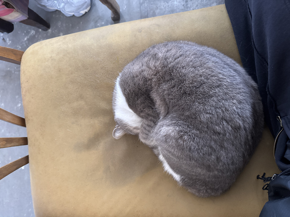 - "A domestic cat, predominantly grey with a distinctive white stripe across its head and back, is observed curled tightly in a sleeping posture on a mustard-yellow upholstered chair cushion" by FM-KmVi82, licensed under CC BY 4.0