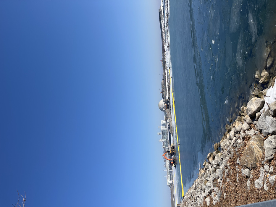 The image captures a winter or early spring waterfront scene at Ontario Place in Toronto, Canada, under a clear, bright blue sky. In the foreground, a rocky shoreline, composed of varying sizes of grey stones, is partially covered with brown leaves and small patches of snow. This shoreline slopes into a body of water, which is extensively covered by broken ice sheets and slush, with some areas of open, dark water. Stretching horizontally across the midground of the water, a bright yellow boom, consistent with a containment or turbidity boom, is deployed parallel to the far shore. On this distant shore, a construction site is active. An orange excavator is positioned partially in the icy water, its bucket lowered, suggesting ongoing dredging or shoreline modification. Adjacent to the excavator on the snowy, earthen bank, a large yellow dump truck is parked. Further to the right, another heavy yellow construction vehicle, possibly a second excavator or bulldozer, operates near piles of dirt and construction debris on the snowy ground. In the background, the distinctive modernist architecture of Ontario Place is visible. The prominent white dome of the Cinesphere stands out, flanked to its left by several interconnected white pod-like structures. The overall environment suggests a cold, clear day with active industrial work taking place along the urban waterfront. No individuals are visible within the frame.