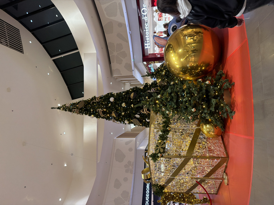 A tilted shot reveals a tall Christmas tree in a shopping mall. The tree is decorated with lights, gold ornaments, and deer figures. Adjacent to it is a large, illuminated gold gift box with a ribbon. A massive gold ball sits next to the tree. A store called "Histoire d'Or" is visible in the background, along with a Stitch character. A person in a black jacket stands near the display.