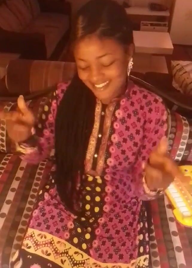 A woman is sitting on a couch and dancing. She is wearing a pink and black patterned dress, and her hair is in long braids. She is smiling and looking down. There is a couch and a table in the background. A toy keyboard is visible to her right.