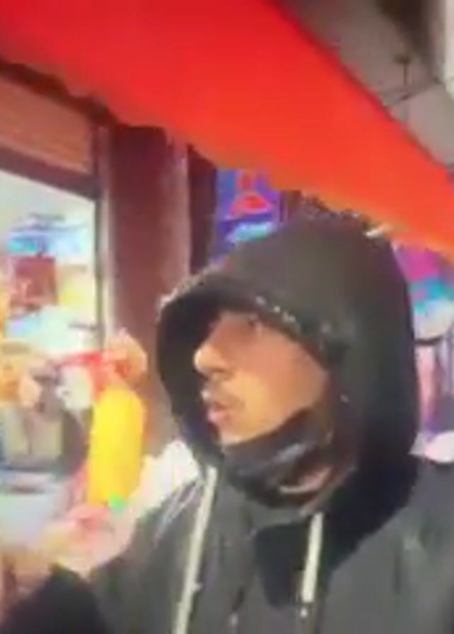 A handheld video taken at night shows two people walking along a city street lined with stores with awnings. One man in a black hooded jacket and scarf is talking into the camera. Another person with a hood up and a face mask walks beside him. The camera quickly pans, showing the street and a white van parked. The camera then shows a woman and two men walking. One of the men has long black hair and is wearing a plaid jacket. The other man is wearing a hooded jacket. They are all walking towards the camera.
