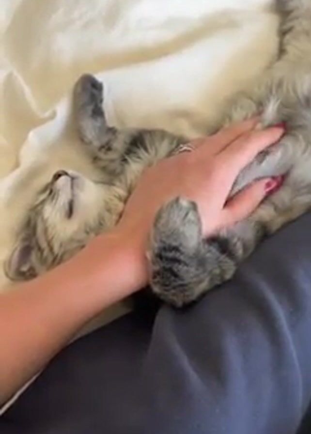 Here’s a description of the video: A kitten is lying on its back on a bed. A person’s hand is resting on the kitten’s belly. The kitten is mostly gray, with dark gray markings, and its eyes are closed, apparently sleeping. The person has pink nail polish on their fingernails and is wearing a ring. The bed has white sheets, and the person is wearing dark blue sweatpants.