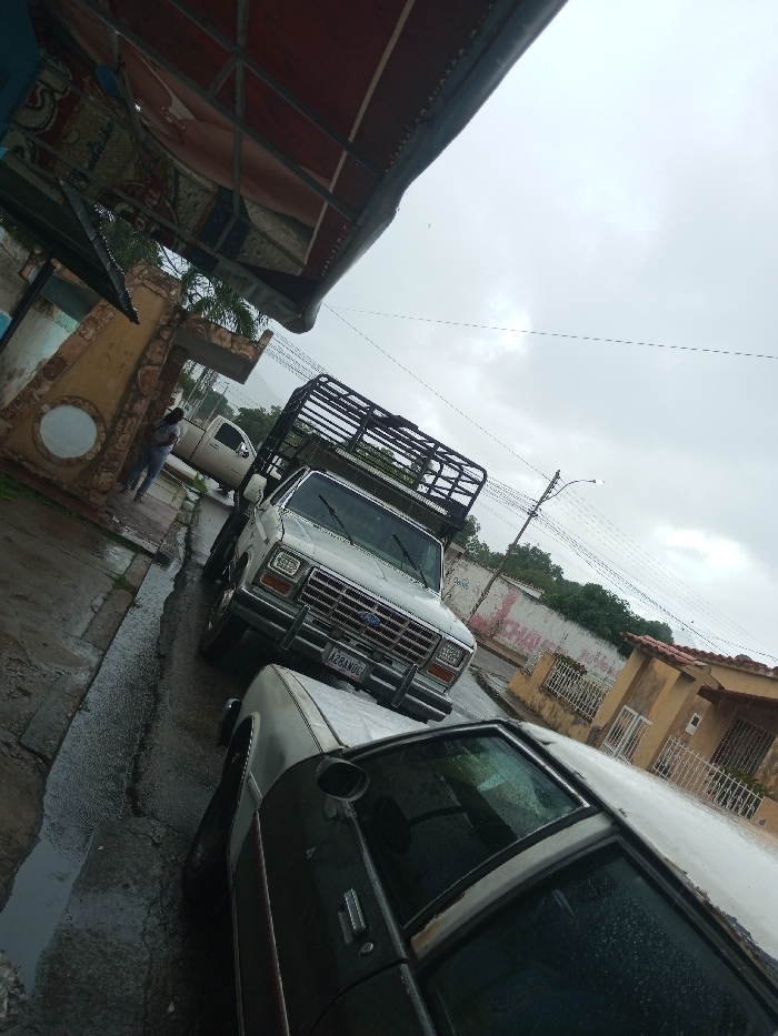 The image captures a street scene in Juan Griego, Venezuela, under an overcast, light gray sky. The ground is wet with visible puddles, indicative of recent rainfall. The perspective is slightly tilted, looking down a narrow street. In the immediate foreground, the hood and roof of a dark-colored sedan or coupe are visible on the left, displaying numerous raindrops. Directly behind this vehicle, a light-colored (possibly white or silver) Ford pickup truck, an older model, is parked. It features a prominent black, open-cage metal rack extending over its bed. The front license plate "A28ANOC" is clearly visible. Further down the street on the left, a white, modern double-cab pickup truck is partially visible, parked on the wet pavement. On the left side of the street, an architectural structure with a red/maroon awning extends into the upper frame. Below it, a light brown building facade exhibits decorative elements including a circular white panel and a textured, possibly stone-like, finish. A single individual, dressed in light-colored pants and a light top, stands on the wet sidewalk next to this facade, partially obscured by the background white pickup truck. On the right side of the street, several residential buildings are visible, including a light brown structure with a terracotta-colored roof and white-barred windows. Further back, a white wall with red graffiti, partially reading "CHAVEZ", is present. Green foliage and trees are visible in the distant background. A utility pole with a street light and overhead power lines traverse the scene. All vehicles appear to be stationary.
