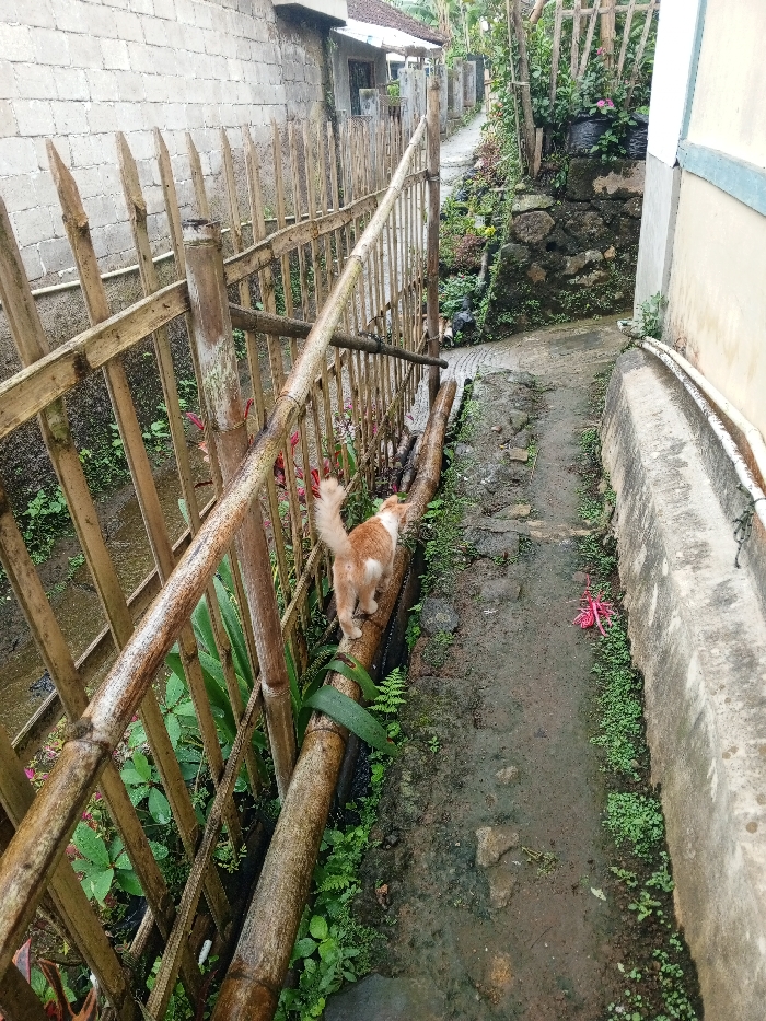 A ginger and white cat traverses a bamboo log alongside a matching bamboo fence. A narrow, uneven stone path, partially overgrown with greenery, stretches between the fence and a concrete wall. The scene exudes a rural, slightly unkempt aesthetic. A drainage ditch runs parallel to the fence. The background reveals a path leading to distant houses. The overall impression is of a quiet, perhaps remote, location.