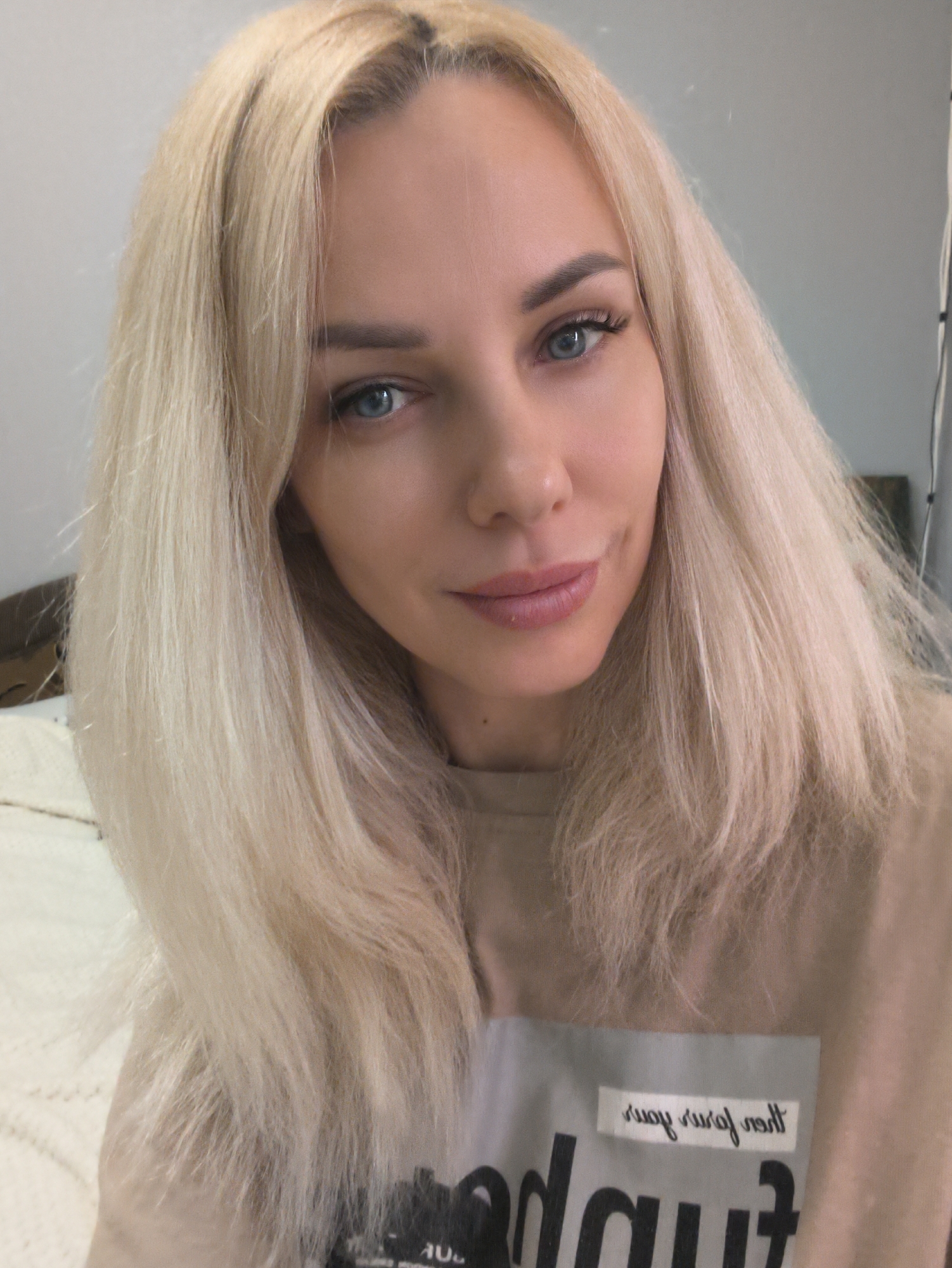 A light-skinned woman with long, blonde hair is centered in a medium, indoor shot. Her hair is parted in the middle and falls around her face and shoulders. She has blue eyes and is looking slightly off-center to the left with a subtle smile. She is wearing a light brown t-shirt with a gray and black rectangular patch. A white label is affixed to the patch, featuring black text. A bed with white linens is visible in the background, partially obscured behind the woman's shoulder. A headboard is also visible. A light-colored wall is behind the woman. A thin, white wire is hanging down the wall to her right. The image has no discernible information that specifies the location in the city of Sevastopol, Ukraine.