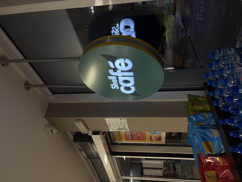 This image depicts an interior view of a Shell Café establishment, located in the city of Pomorie, Bulgaria
