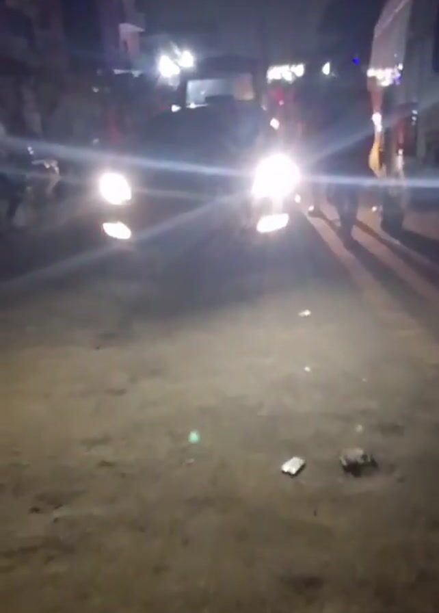 street scene at night. Several vehicles with bright headlights are visible in the distance and moving towards the camera. A person is standing to the right of the camera, partially obscuring the view. The ground is uneven and covered with debris. There is background noise of music and voices. The overall lighting is poor and blurry, making it difficult to discern details clearly.