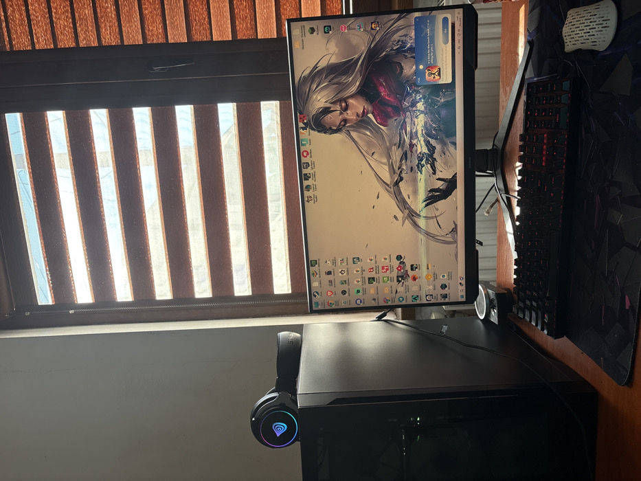 The scene depicts an indoor computer workstation in Dolni Bogrov, Bulgaria. A dark, full-tower PC case with a transparent side panel is positioned on the left side of a wooden desk. On top of the PC case rests a pair of black over-ear headphones, featuring a glowing, multi-color RGB logo (Genesis brand visible) on the left earcup. To the right of the PC case, a flat-screen monitor (Samsung brand visible on the lower bezel) displays a desktop with numerous application icons arranged along the left edge. The monitor's wallpaper depicts an artistic rendition of a female figure with long, flowing white hair, a red-hued garment, and a hand extended over swirling blue and white energy. A pop-up notification box, partially obscured, is visible in the lower right corner of the screen, stating "It's time for the lunch break, it's time for you." Directly in front of the monitor, a black mechanical keyboard with red backlighting is situated on a dark-patterned gaming mousepad. To the right of the keyboard, a white gaming mouse with a perforated, textured shell is also on the mousepad. Behind the desk, a large window dominates the background, fitted with horizontal zebra blinds alternating between translucent light and opaque dark brown stripes. Bright natural sunlight streams through the translucent sections, casting horizontal light patterns across the scene. A light-colored wall is visible to the left of the window. Below the window, a white radiator is present. A small, dark cylindrical object, possibly a cup or container, is located on the desk between the PC case and the monitor stand. No individuals are present in the image.
