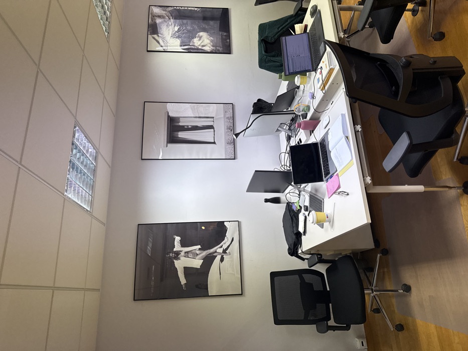 The image displays an unoccupied office interior situated in Paleo Faliro, Greece. The room features white walls, a white grid-panelled ceiling with recessed fluorescent light fixtures, and a light-colored wooden floor. Three large, framed monochromatic art prints are mounted on the white wall. The leftmost print depicts a nude female figure wearing an open white shirt, balancing on a curved surface. The central print shows a window or doorway with curtains, revealing a partial figure obscured behind them. The rightmost print features a layered composition, appearing to show a person's upper body partially obscured by horizontal blinds or textures. Multiple white-surfaced desks are arranged to form a connected workstation. At least three black office chairs with mesh backs and fabric seats on casters are positioned at these desks. The desks contain various items: at least three laptops (two open with illuminated screens, one closed), two external computer monitors (one black, one silver), multiple water bottles (one pink, one black), disposable coffee cups, notebooks, pens, sticky notes, computer mice, and charging cables. A dark green jacket is draped over one of the chairs. No individuals are present in the scene.