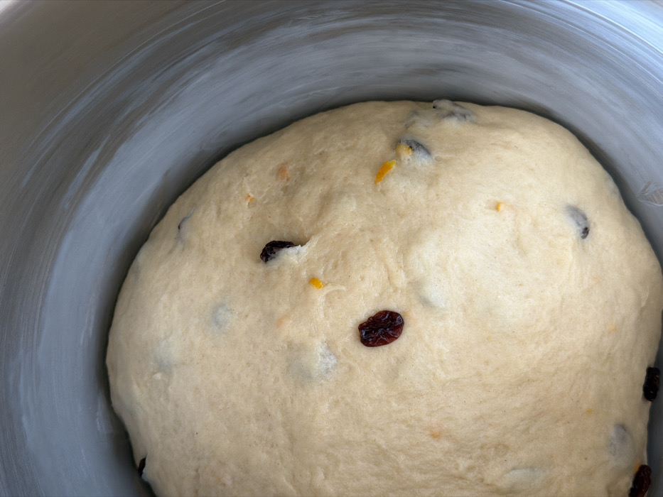 A close-up, top-down view reveals a light tan, opaque dough mass occupying the lower portion of a round, light gray-white bowl. The dough exhibits a smooth, slightly irregular surface, consistent with a rising process. Embedded within the dough are numerous dark reddish-brown, ovoid inclusions, likely dried fruit such as cranberries or raisins, along with smaller, irregular bright orange fragments, consistent with citrus zest or candied peel, and occasional small white pieces. The interior surface of the bowl above the dough displays faint, concentric or swirling marks. No individuals, explicit actions, or external environmental details beyond the bowl are visible. This scene is located in Bretton, United Kingdom.