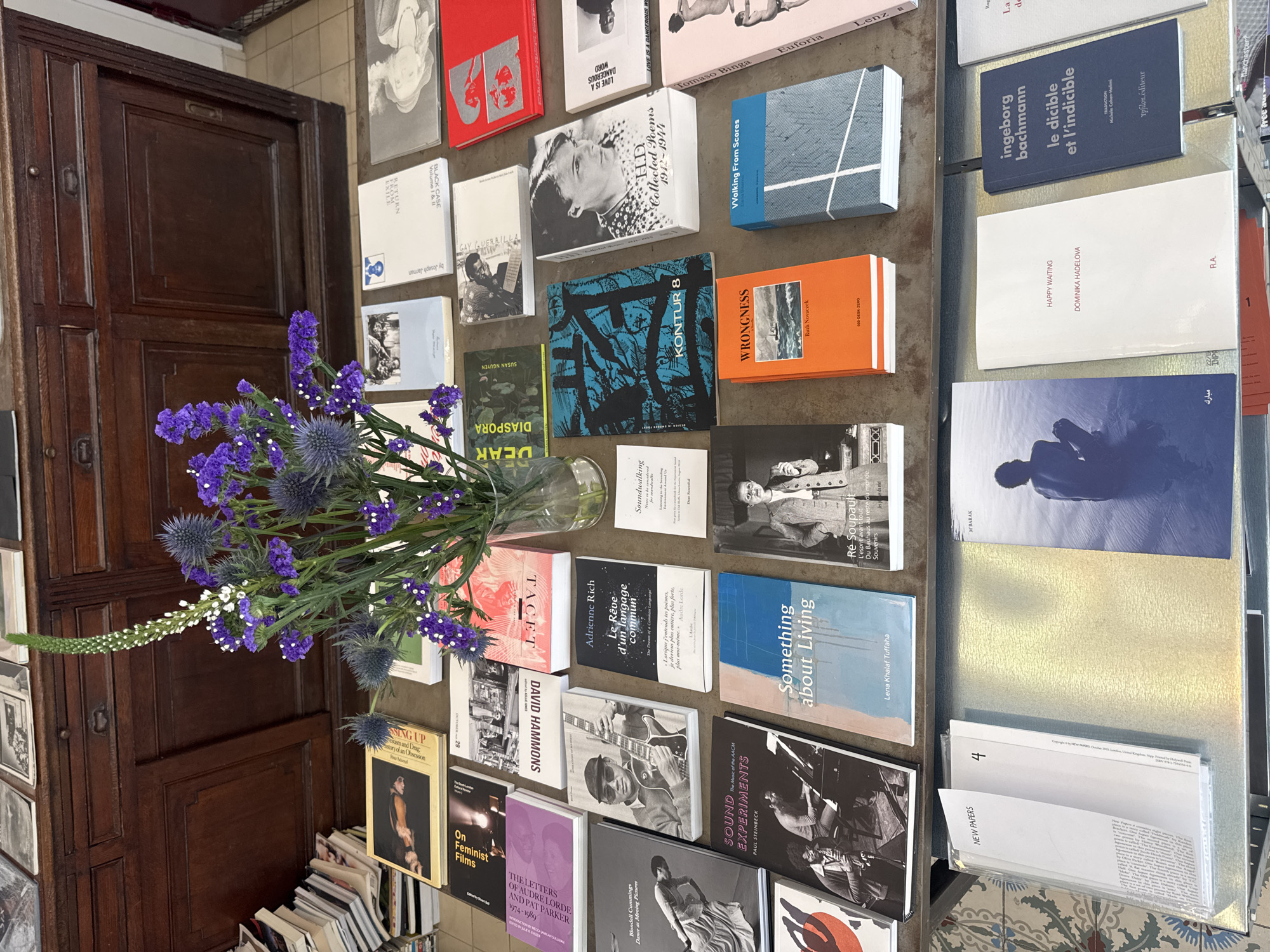 A collection of books is arranged on a table, with a vase of purple flowers on the left. Book titles include "On Feminist Films," "The Letters of Audre Lorde and Pat Parker," "Sound: The Music of the AACM Experiments," "New Papers," "Le Rêve d'un langage commun," "Something about Living," "Ré Soupault," "Black Case," "Kontur 8," "HD Collected Poems," "Wrongness," "VValking From Scores," "Euforia," and "Ingeborg Bachmann le dicible et l'indicible." The table surface is dark, and a wooden cabinet is visible on the left.