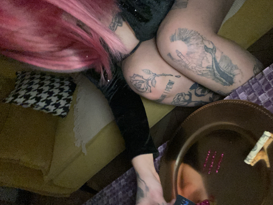 A person with pink hair is reclining on a yellow couch with a houndstooth pillow. They are wearing a black outfit, and their legs are covered in tattoos. Next to them is a brown platter with what appears to be lines of a pink substance, as well as a rolled-up dollar bill and some other items. The overall impression is of a casual, somewhat decadent scene.