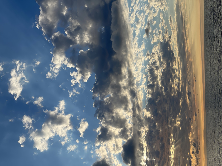 A seascape at sunset features a predominantly cloudy sky. The upper portion has scattered white clouds against a blue backdrop. Below, a layer of darker, heavier clouds is interspersed with patches of light. The lower third of the image displays smaller, textured clouds tinged with golden hues. The horizon line separates the sky from the calm, dark water. Sunlight filters through the clouds, creating a dynamic play of light and shadow.