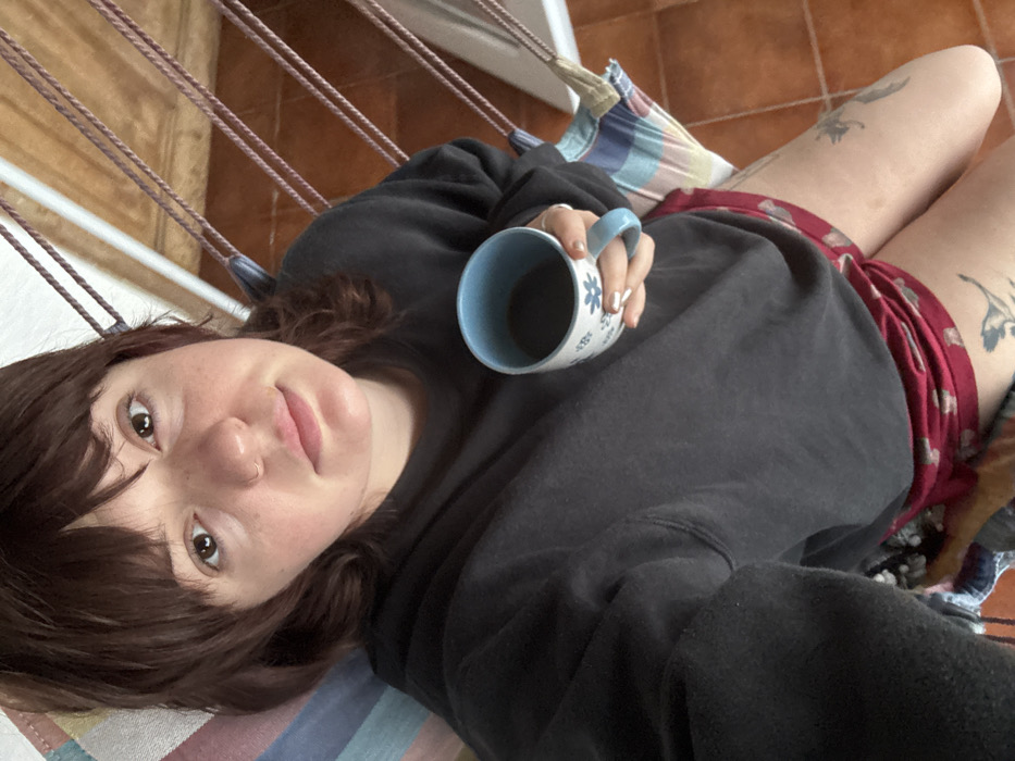 An individual is depicted reclining in a multi-colored striped fabric hammock indoors in San Pablo La Laguna, Guatemala. The individual is a female with shoulder-length brown hair and bangs, a small nose ring in her left nostril, and white nail polish. She wears a dark grey long-sleeved sweatshirt and red shorts with a light-colored pattern. Tattoos, depicting plant or floral designs, are visible on her upper thighs. She holds a white mug with a blue interior and blue floral patterns in her right hand, containing a dark liquid. The individual looks directly at the camera with a neutral expression. The flooring is composed of terracotta-colored square tiles, and braided ropes of the hammock extend upwards towards visible wooden and white ceiling structures.