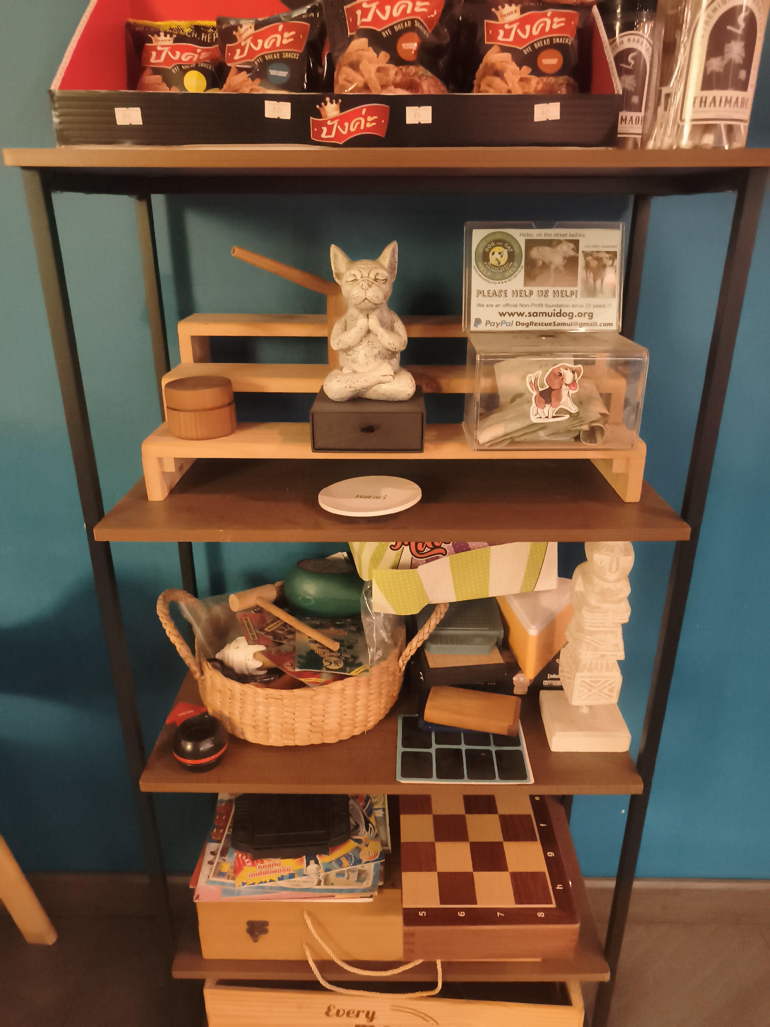 four-tiered display shelf against a teal blue wall. On the top shelf are packages of "ปังคะ" rye bread snacks in a black box with red trim, along with other packaged goods. The second shelf holds a grey statue of a cat in a meditative pose, a wooden step-like display stand, a small cylindrical wooden container, a small black box, a clear plastic donation box with a dog sticker on it, and a sign that reads "PLEASE HELP US HELP! We are an official Non-Profit foundation since 25 years !!! www.samuidog.org PayPal DogRescueSamui@gmail.com." The third shelf has a woven basket filled with various items, a green container, a checkered cloth, a small yellow and white box, a small rectangular object, and a stacked white statue. The bottom shelf has a stack of magazines and a wooden box with a rope handle. Below the bottom shelf is another box with the word "Every" printed on it. The OCR indicates that the location is possibly Baan Bo Phut, Thailand due to the Thai script on the snack packages and the reference to "Samuidog" in the donation sign.