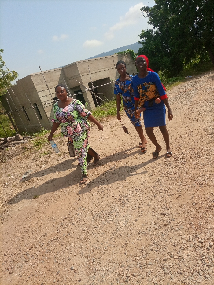 Three adult females are walking on an unpaved, reddish-brown dirt road in Adankolo, Nigeria, under a clear sky with scattered clouds