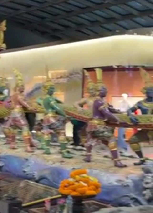 statue of a multi-headed snake or dragon being pulled by several human figures in an airport terminal. The dragon is golden and red, and the figures are painted in different colors. There are offerings in front of the statue, and a Louis Vuitton store is visible in the background. People can be seen walking past in the airport. The statue is very elaborate and colorful.