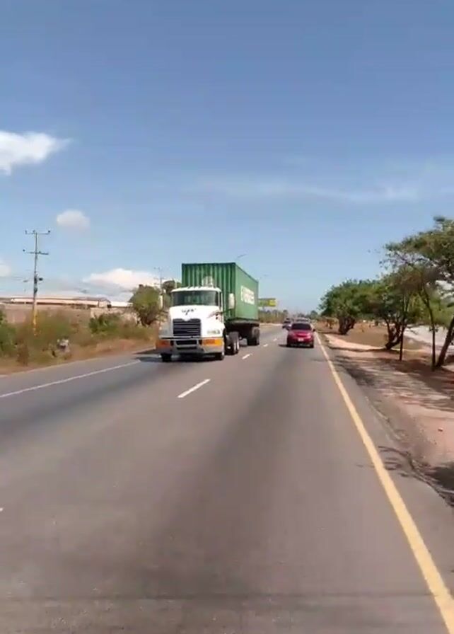 n asphalt road with a yellow line marking its right edge, captured from a moving vehicle traveling on a sunny day. A white tractor trailer with a green "Evergreen" container moves in the opposite direction. Following it is a red sedan. Then, a red "Hamburg SUD" container truck is captured as the filming vehicle passes it. The background features clear, blue skies dotted with scattered clouds, utility poles, and trees lining the roadside. A small portion of the "Infinix SMART 8" watermark is visible at the bottom of the frame.