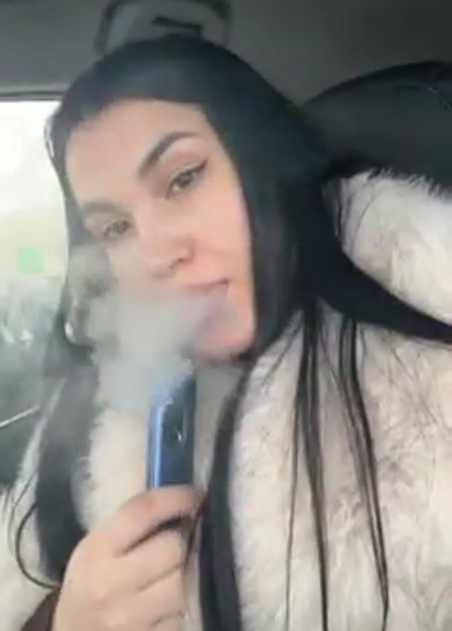 A young woman is sitting in the driver's seat of a car, dressed in a white fur-like coat, with long dark hair. She is vaping, as a plume of vapor is seen coming from her mouth. She holds a blue vape pen in her hand. The background shows the interior of the car and a glimpse of a blurry outdoor scene.
