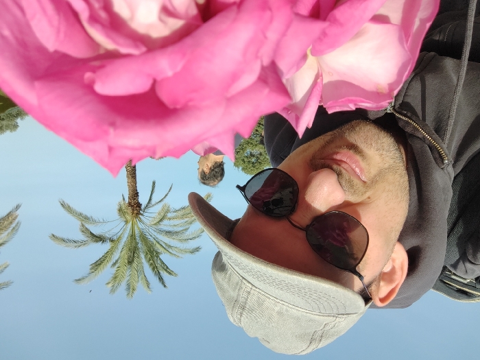 The image captures an outdoor scene in Zikhron Yaakov, Israel, under a clear, bright blue sky. In the immediate foreground, a large, vibrant pink rose with lighter pink and white inner petals occupies the lower right quadrant of the frame, appearing in sharp focus. A male individual is positioned in the left midground, leaning forward with his head tilted down towards the rose. He wears a grey baseball cap, dark-lensed sunglasses with a black frame, and a dark grey zippered hooded sweatshirt. Stubble is visible on his face, and a dark strap, possibly from a backpack, is over his left shoulder. In the background, partially obscured by the foreground rose, a second male individual is visible from behind, facing towards the right. He has short, light brown hair and wears a dark shirt. Multiple tall palm trees are prominent in the background against the bright sky, with additional green foliage suggesting a park or garden setting. The scene is brightly illuminated by natural light.