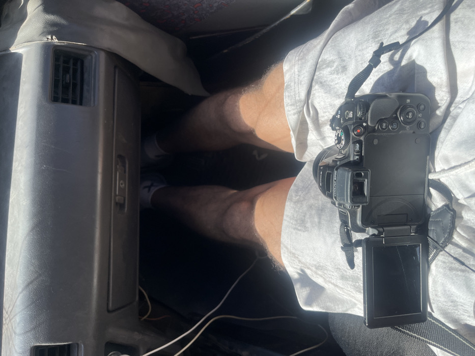 The image depicts a first-person perspective from the interior of a vehicle in Sarouja Municipality, Syria. The scene shows the bare legs of an individual wearing light gray shorts, white socks, and white sneakers, seated in what appears to be the driver's seat or a similar forward-facing position. A black Nikon Coolpix B700 digital camera, with its articulating screen extended and dark, rests on the person's lap. The vehicle's dashboard, visible in the upper portion of the frame, is dark gray, showing a glove compartment with a latch, an air vent on the right, and what appears to be dust accumulation. A white cable is visible hanging down from the dashboard on the left side. Harsh sunlight casts shadows within the car's interior. A portion of patterned upholstery (red and black) is visible on the far right, likely part of an adjacent seat.