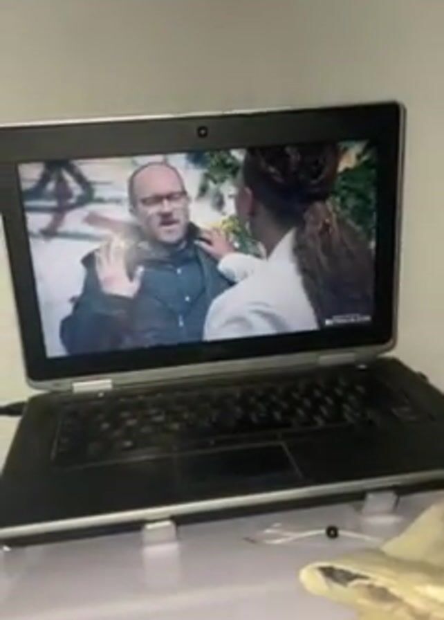 A laptop is sitting on a white surface, playing a scene from a TV show
