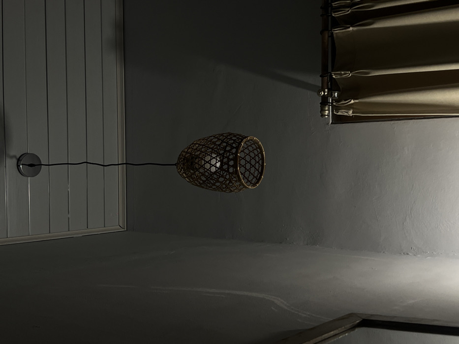 A dark and dimly lit room features a vertically oriented gray paneled wall on the left and a gray wall on the right. A woven lamp with a visible bulb hangs suspended from a black cord connected to a circular wall mount on the paneled wall. A tan-colored blind hangs near the top right corner. At the bottom right, a portion of a framed object is visible. The floor and walls blend together due to the low lighting.
