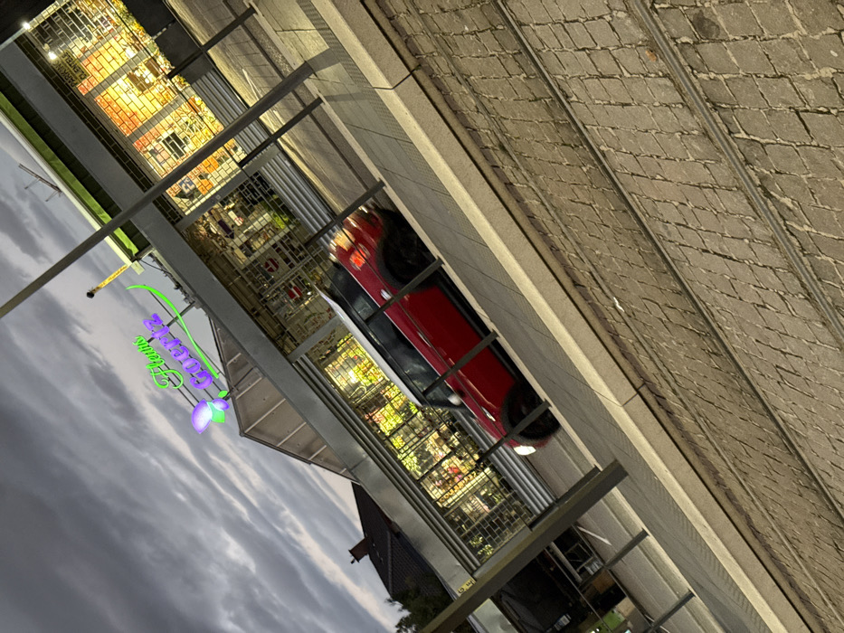 A tilted perspective shows a cobblestone street, adjacent to a covered walkway with metal supports. Inside, a red car is visible. Buildings line the other side, some with illuminated interiors seen through metal grates. A green and purple "Florist" sign hangs from the structure. Cloudy sky is in the background.