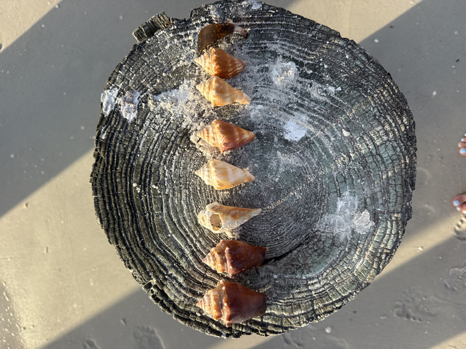 Eight seashells are arranged in a linear sequence on the weathered, circular top surface of a dark wooden post. The shells display varying hues of reddish-brown, orange, and beige, predominantly conical or spiral in form; the third shell from the left exhibits damage. The wooden post features pronounced concentric growth rings, extensive weathering, and a top surface partially covered in light-colored granular residue. The post is situated in light brown, fine-grained sand. Direct sunlight illuminates the scene, evidenced by a prominent diagonal shadow in the background. The lower portion of the image shows the distal ends of two human feet, marked by light blue toenail polish, positioned on the sand. This scene is observed on a beach in Naples, United States of America.