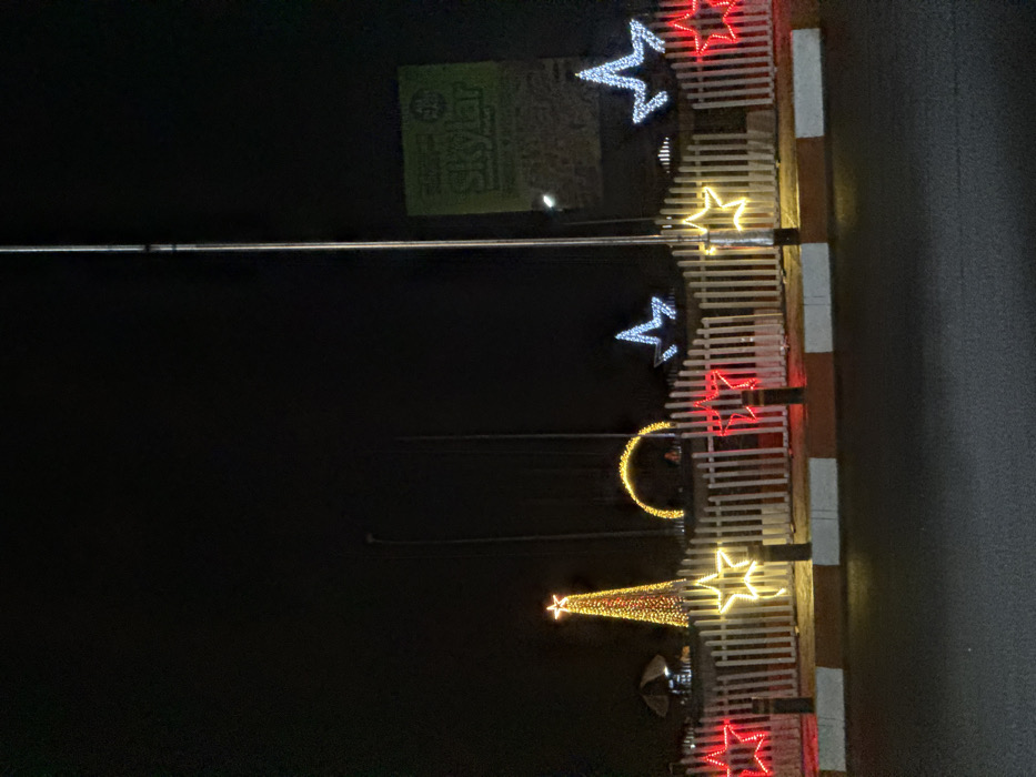 A vertical shot at night shows a decorated barrier. The barrier has white horizontal slats with white and red vertical posts. Christmas lights in the shape of stars, a crescent moon, and a Christmas tree adorn it. A tall metal pole runs along the top of the barrier. A sign with green background is slightly blurred in the background. The dark pavement is visible on the right side.