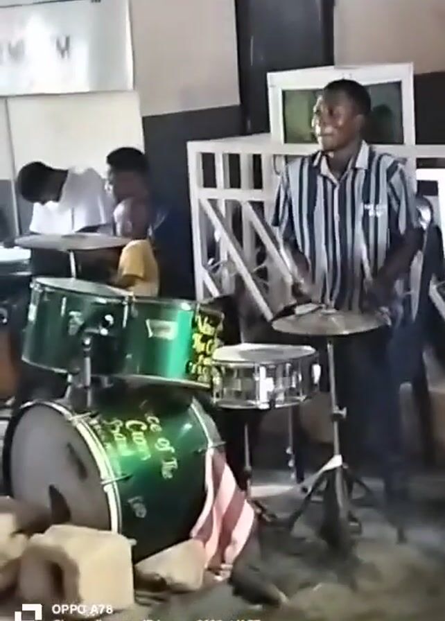 A man is playing the drums in a room. He is wearing a striped shirt and jeans. The drums are green, and there is a bass drum with text on it. There are other people in the room, including one in a white shirt who is writing something, and a child in a yellow shirt. The room is filled with furniture and other items. The video also has text at the bottom, including the brand of the phone that recorded the video and the date.