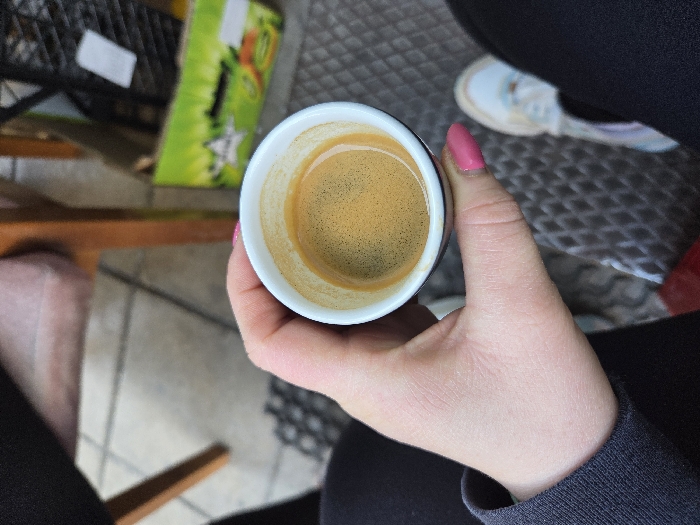 - "An overhead, first-person perspective image captures an individual's left hand holding a small, white ceramic espresso cup filled with a shot of coffee topped with a golden-brown crema" by FM-RWGJp2, licensed under CC BY 4.0