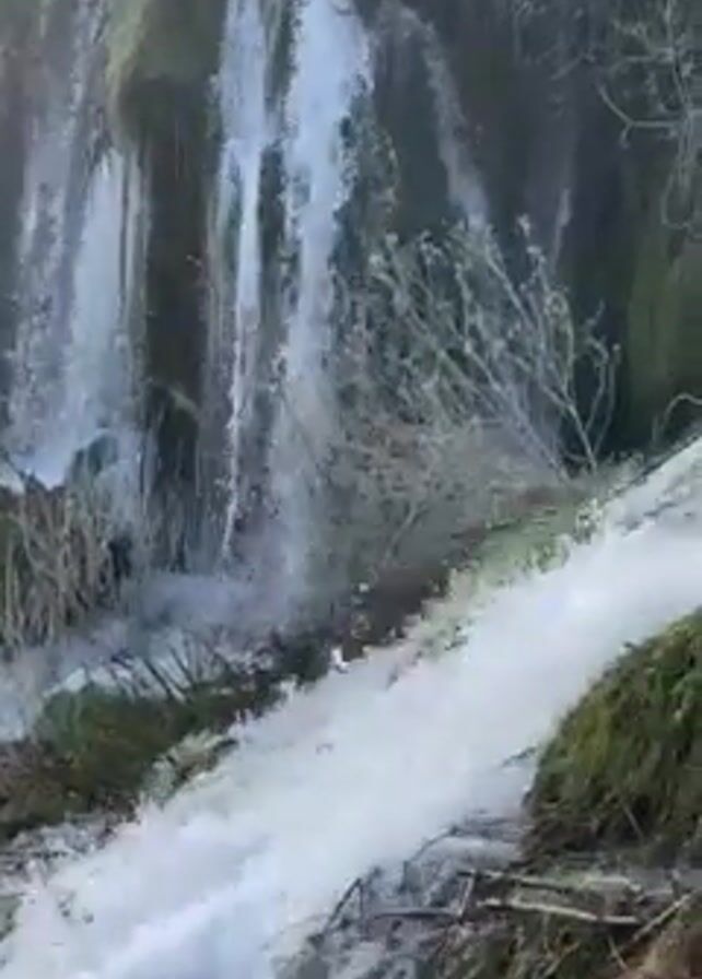 The video depicts a multi-tiered waterfall cascading over mossy rocks and vegetation. The water is white and foamy as it flows. There are bare branches and frosted vegetation surrounding the waterfall.