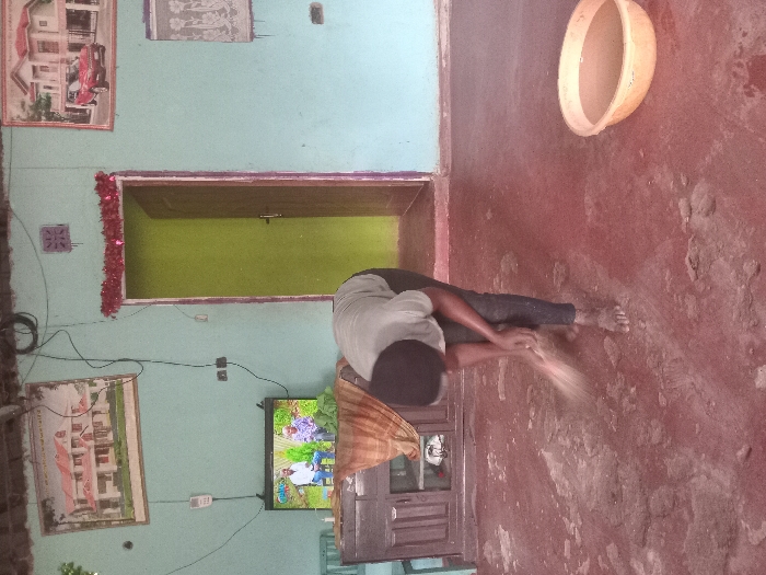 An individual is sweeping a reddish-brown floor with a broom. The room features blue walls adorned with framed pictures and decorative floral arrangements around a doorway. A television displays a program on a stand nearby. An empty, round vessel hangs on the wall in the background.