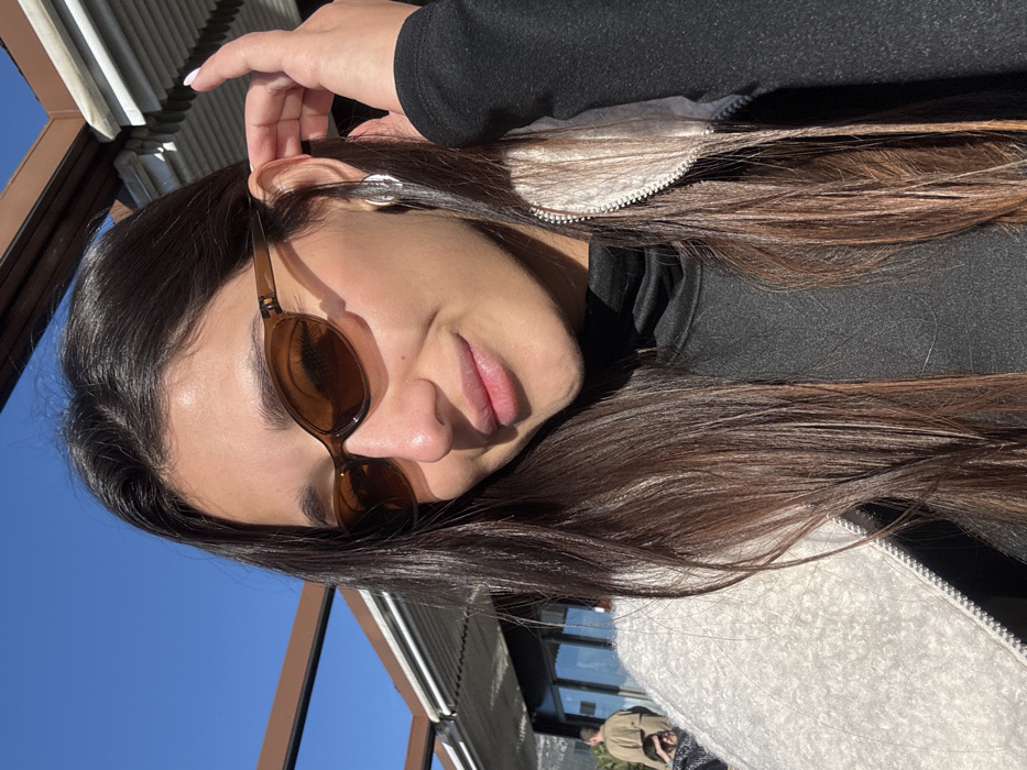 A young adult female is depicted in a medium close-up, outdoors, under a clear blue sky, in what appears to be a sheltered seating area. The scene is located in the city of Šušanj, Montenegro. The female has long, straight, dark brown hair that cascades over her shoulders. She is wearing brown-tinted oval sunglasses and a silver-colored hoop earring on her visible right ear. Her attire consists of a black high-neck top or sweater beneath a light cream or off-white fleecy zip-up jacket, with the zipper partially visible. Her left hand is raised, with fingers lightly touching her hair near her left ear. She exhibits a faint smile and is looking directly towards the camera. In the background, out of focus, a building with large dark windows is visible. Two blurred figures are partially discernible to the left of the main subject; one appears to be a standing individual in a light brown jacket, and another is a lower, indistinct form. Overhead, elements of a brown metal pergola or awning structure and white horizontal slats are visible. The scene is brightly illuminated by direct sunlight, casting shadows.