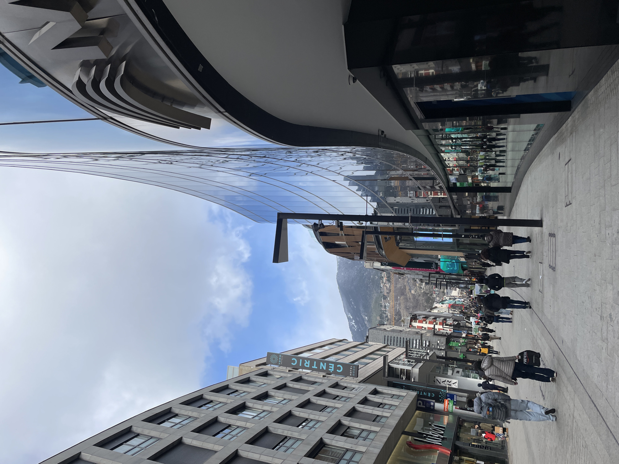street in Andorra la Vella, Andorra, with a glass-covered shopping area on one side. People are walking along the paved walkway. A mountain range is visible in the background. Buildings line the street, one of which has a "CENTRIC" hotel sign. Overhead structures, likely part of the shopping area, are present. The sky is partly cloudy.