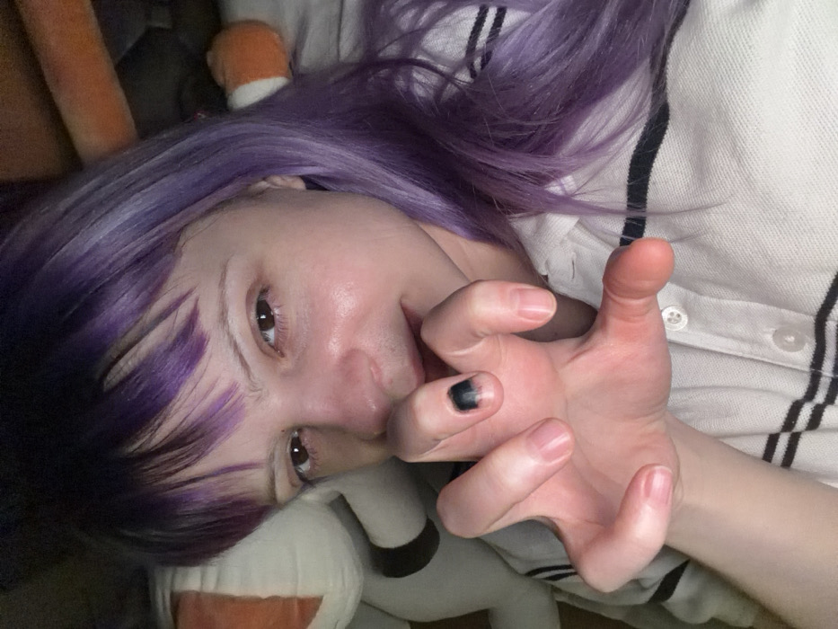 An individual with purple hair and bangs is depicted in a close-up, dimly lit indoor setting in Sof'ino, Russia. The person is looking directly at the camera. They have light skin and are wearing a light-colored collared shirt with horizontal dark stripes. Their right hand is positioned in the foreground, with fingers curled into a claw-like pose. The thumbnail of this hand is painted black, while the other nails appear natural. In the background, out of focus, a white stuffed animal with orange markings is partially visible to the left, and an orange cylindrical object is visible to the upper right.