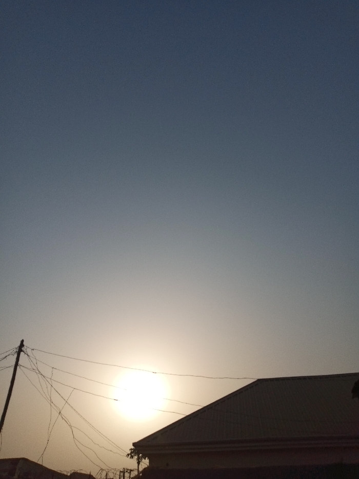 The image depicts a pale, hazy sky transitioning from a light gray near the horizon to a slightly darker blue at the top. A bright, indistinct sun is near the horizon, partially obscured by the silhouette of a building's rooftop. Power lines and a pole are visible on the left side, adding to the urban or suburban setting. The overall mood is soft and muted, likely captured during sunrise or sunset.