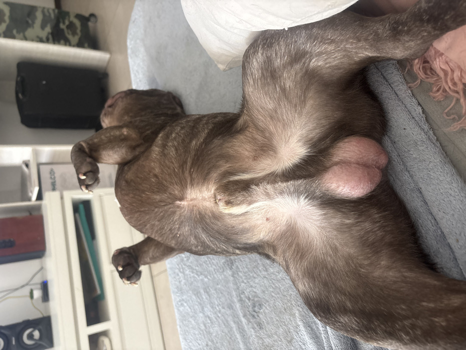 A brindle-colored bulldog lays on its back with its head near a white cabinet. Its feet are flexed and its claws are visible. The dog's testicles are prominent, positioned between its hind legs. The dog rests on a light gray fabric. A black suitcase and items in the cabinet are visible in the background.