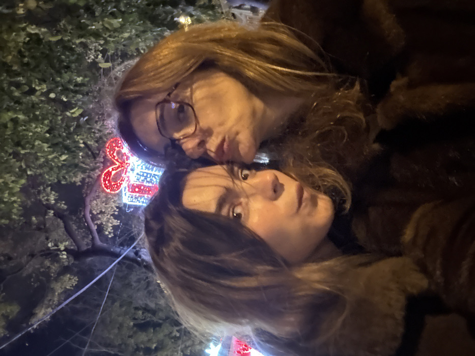 Two women are posed closely together, with the woman on top wearing glasses and pouting. Both have light skin and shoulder-length hair. The top woman's hair is a golden brown while the bottom woman's hair is dark brown. They are positioned in front of trees illuminated with white and red Christmas lights. The women wear dark clothing. The image appears to have been taken at night, with limited lighting.